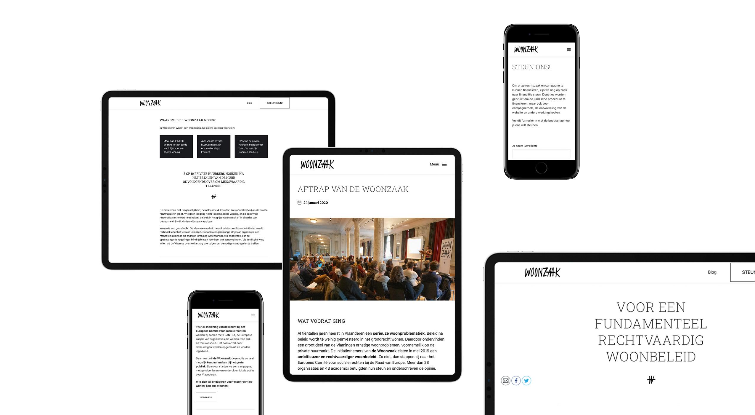Woonzaak pleit voor een fundamenteel rechtvaardig woonbeleid in Vlaanderen. Dat doen ze op twee vlakken: enerzijds roepen ze de overheid ter verantwoording, anderzijds willen ze via brede campagnes het recht op wonen in de kijker zetten.